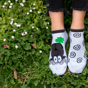 Zeķu dizainu papildina četrlapu āboliņa motīvs – veiksmes simbols, kas piešķir tēlam rotaļīgumu un pozitīvu noskaņu.